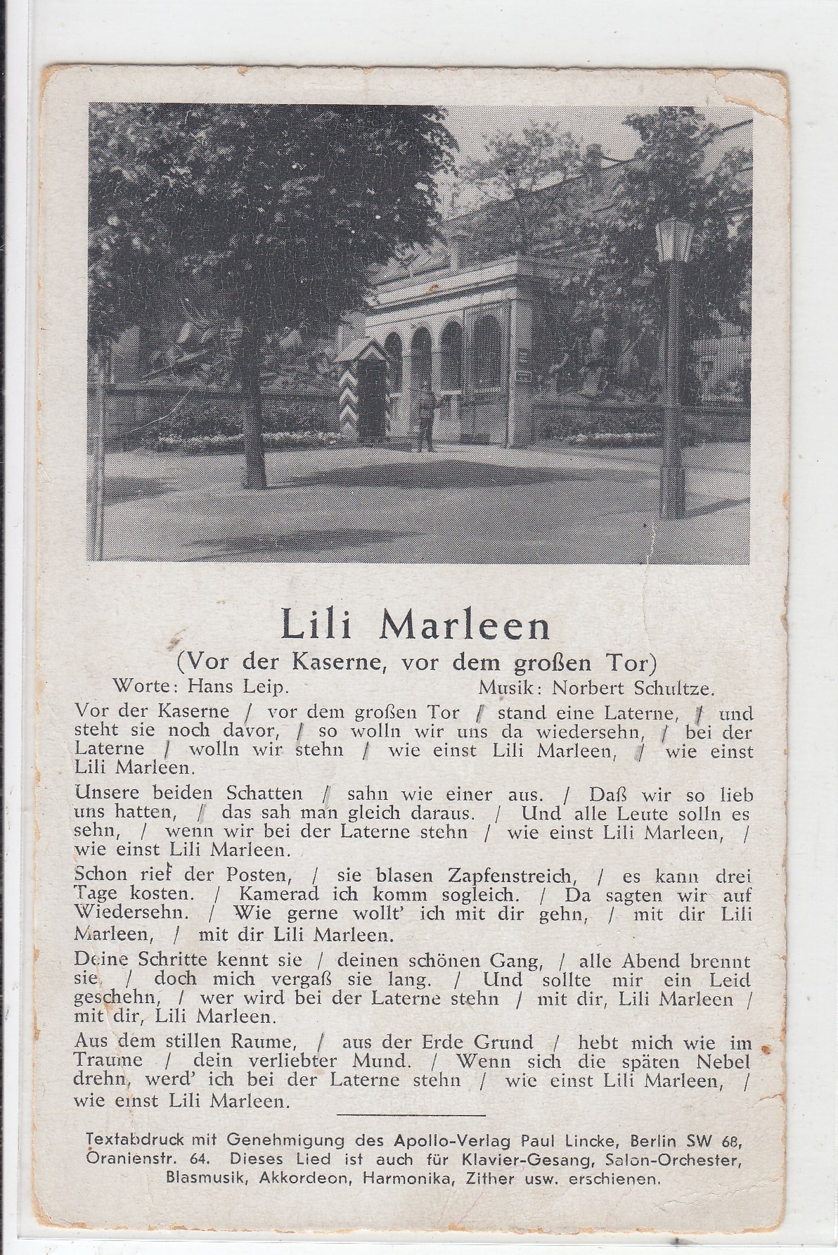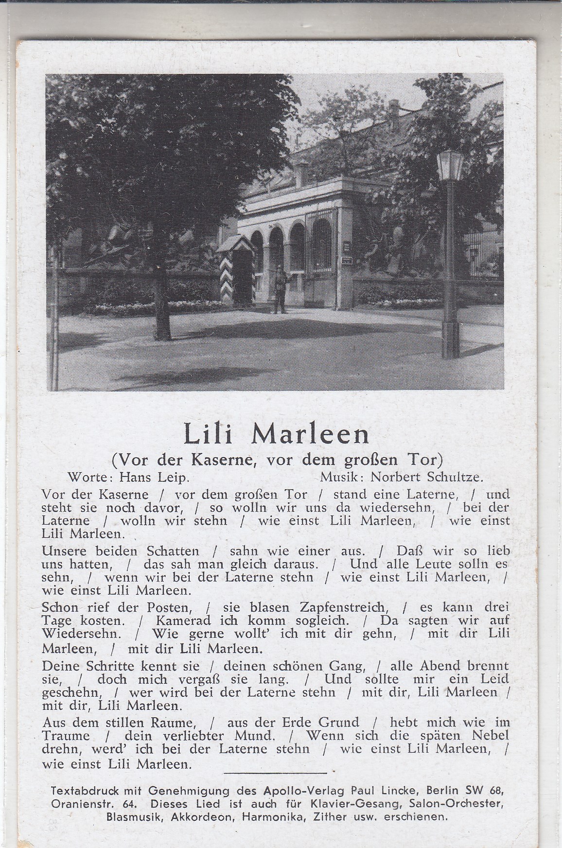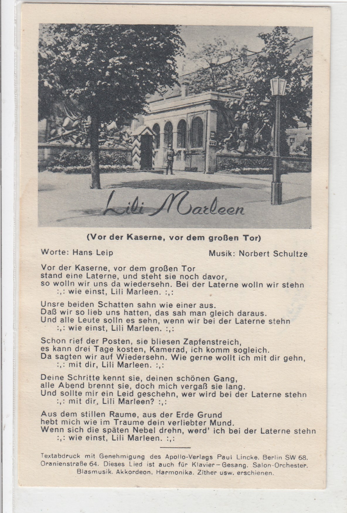 295 [440317] |  | Liedkarten Musik vor 1945 Kaserne Lili Marleen | 3.00EUR | In den Warenkorb |