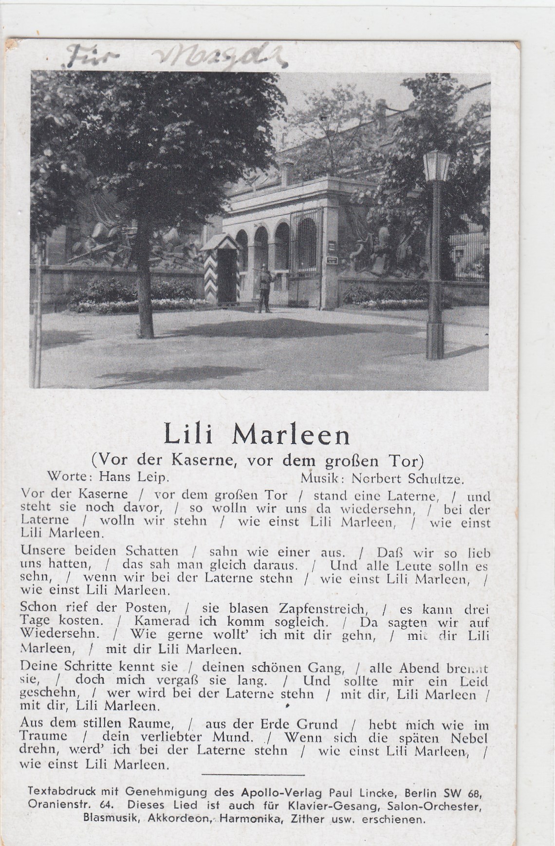 296 [440327] |  | Liedkarten Musik vor 1945 Kaserne Lili Marleen | 3.00EUR | In den Warenkorb |