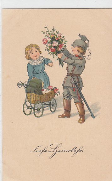 alte Ansichtskarte mit Kinder in Militär Uniform , Kinderwagen