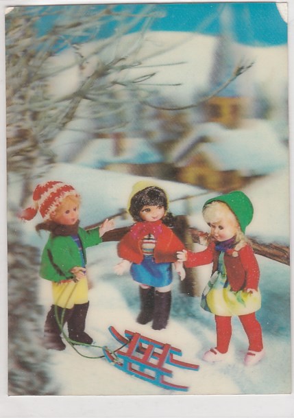 3D Ansichtskarte Kinder Wintersport Schlitten