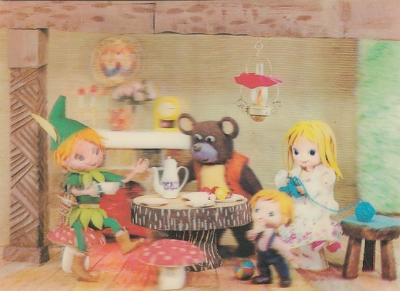 3D Ansichtskarte Peter Pan beim Bären Märchen Sagen Pilze
