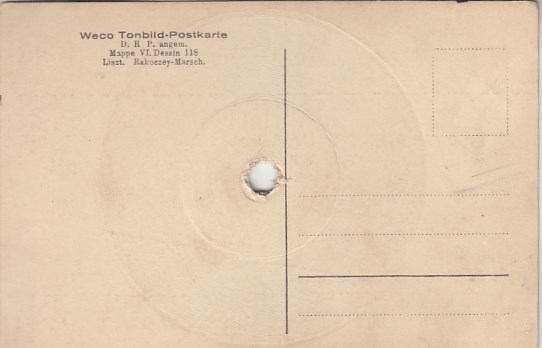 85 [m19195] |  | Besonderheiten Schallbildkarte Schallplatte Weco Tonbild-Postkarte Musik Rakocey-Marsch | 22.00EUR | In den Warenkorb |