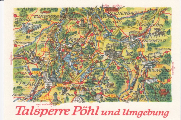 Postkarte als Landkarte Talsperre Pöhl Jocketa Ruppertsgrün Neuensalz Möschwitz Helmsgrün Neudör
