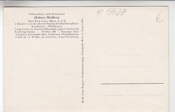 728 [5427w154] |  | Höhen-Hotel Hohen-Malberg bei Bad Ems ca 1940 | 6.00EUR | In den Warenkorb |