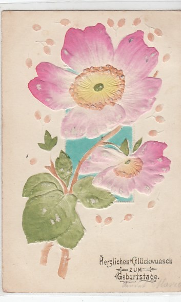 Prägekarte AK mit Relief Blumen Vögel Glückwunsch Geburtstag