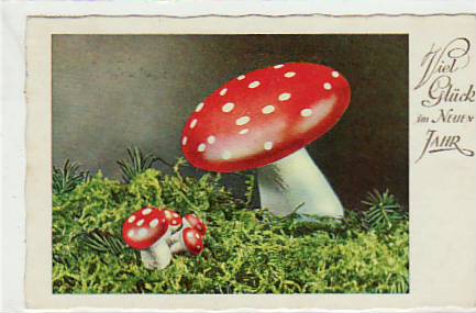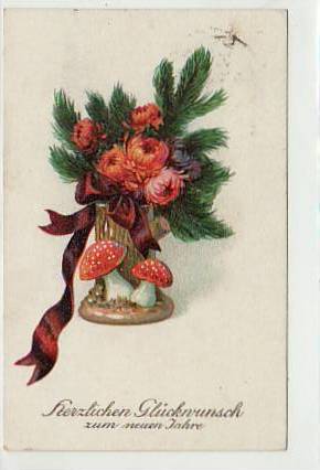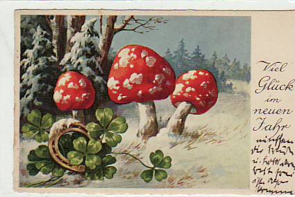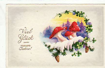 Pilze Glückwunsch Neujahr Kleeblatt ca 1955