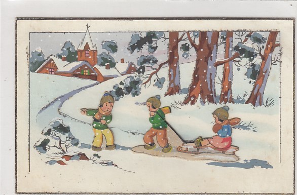 Ansichtskarten Besonderheiten 3D ca 1910 Kinder und Schlitten aufgeklebt mit Glitzersteinen Wint