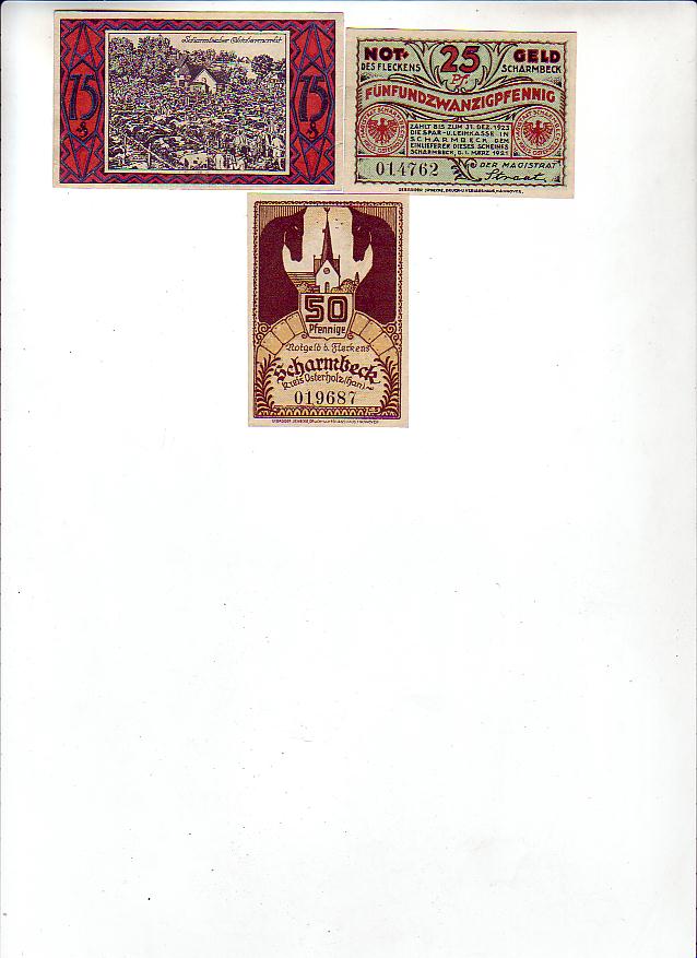 Scharmbeck 3 Scheine Notgeld mit Bildern der Stadt