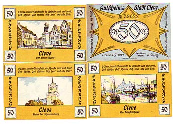 4 Scheine Notgeld mit Bildern der Stadt Cleve Kleve