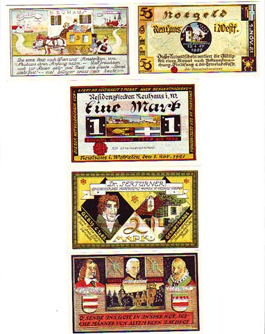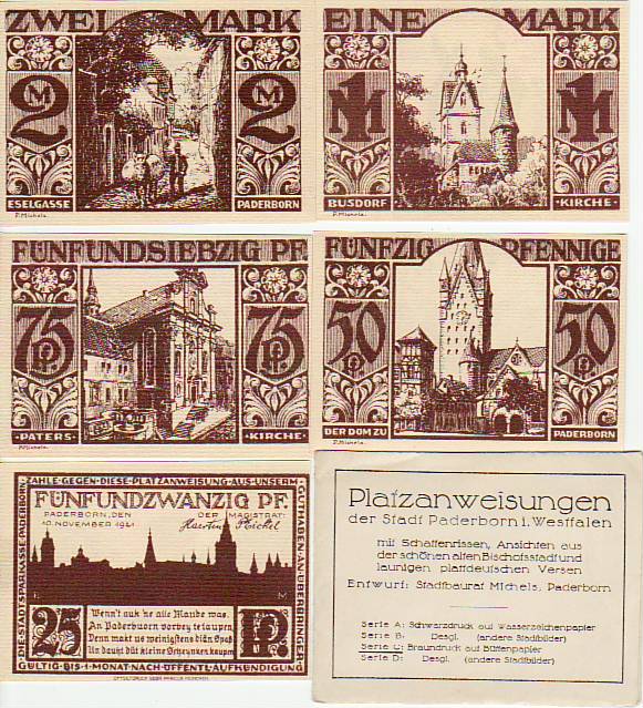 5 Scheine Notgeld mit Bildern der Stadt Paderborn