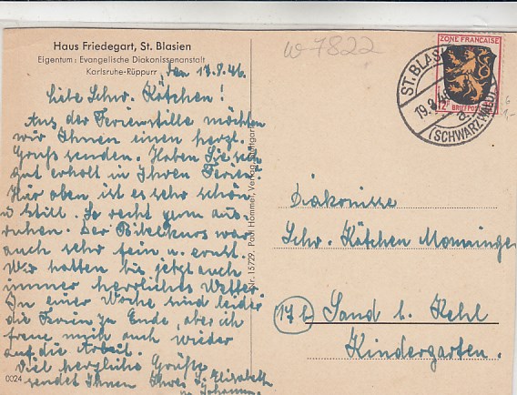 652 [7822w16] |  | St.Blasien Schwarzwald Haus Friedegart Diakonissenanstalt Karlsruhe-Rüppurr 1946 | 4.00EUR | In den Warenkorb |