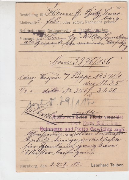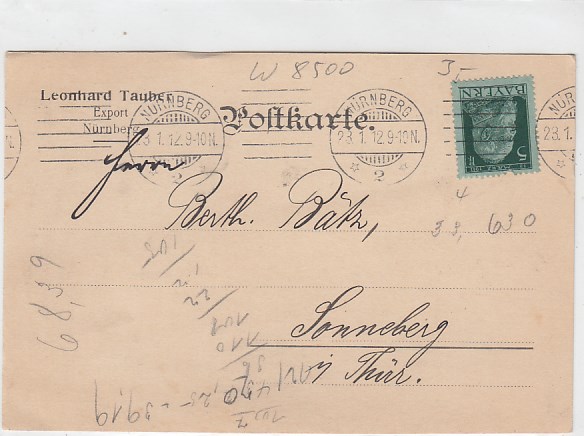 Nürnberg Postkarte Werbung Leonhard Tauber 1912