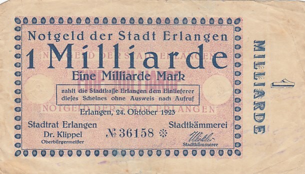 Erlangen Notgeld Geldschein eine Milliarde Mark 1923