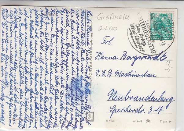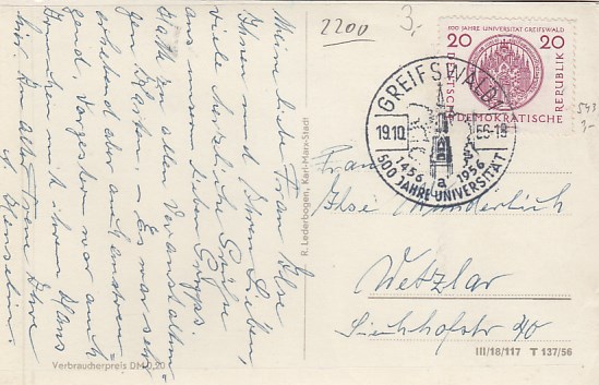 Greifswald Anlaß Stempel Universität 1956