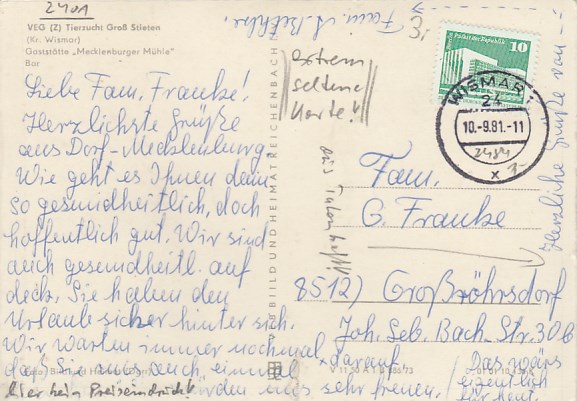 253 [2401o52] |  | Groß Stieten VEB Tierzucht,Gaststätte Windmühle 1981 | 3.00EUR | In den Warenkorb |
