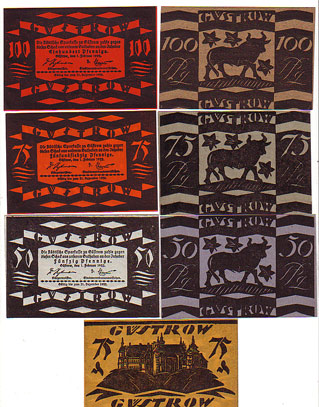 7 Scheine Notgeld mit Bildern der Stadt Güstrow