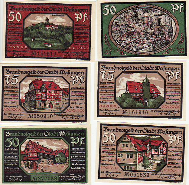 Wasungen Werra 6 Scheine Notgeld mit Bildern der Stadt 1921