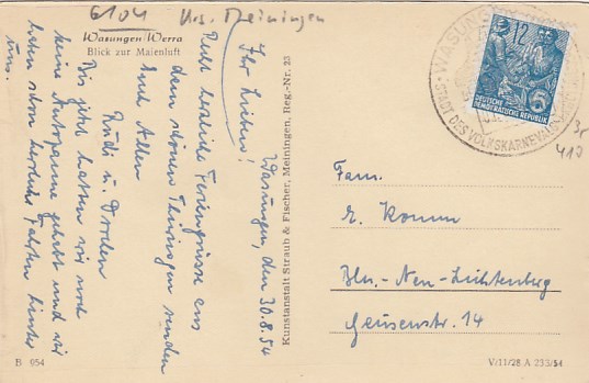 Waffenrod-Hinterrod Thüringen mit Landpoststempel 1954