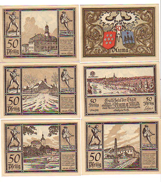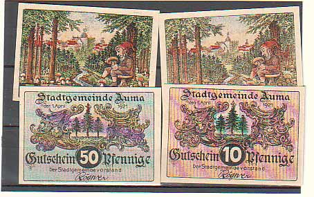 6 Scheine Notgeld mit Bildern der Stadt Auma Thüringen