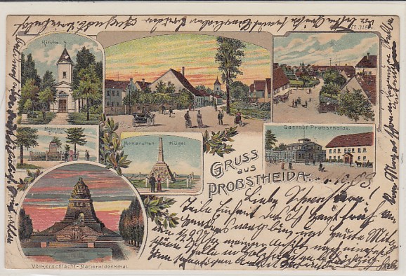 Leipzig Stadtteil Probstheida Litho Ansichtskarte mit Völkerschalchtdenkmal 1903