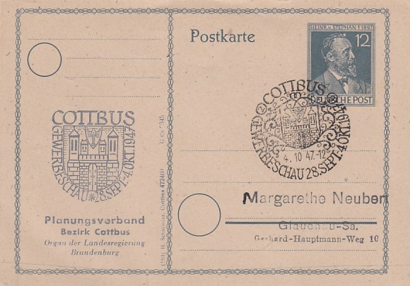 Postkarte mit Anlaß Stempel Cottbus Gewerbeschau 1947 Ganzsache