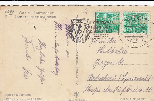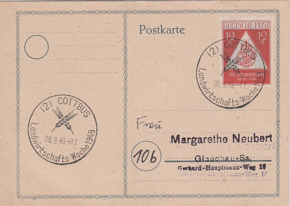 Postkarte mit Anlaß Stempel Cottbus Landwirtschafts-Woche 1949