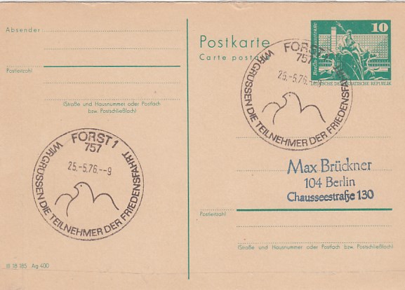 602 [7500o1278] | ![]() | Postkarte mit Anlaß Stempel Forst Fahrrad Friedensfahrt | 2.00EUR | In den Warenkorb |