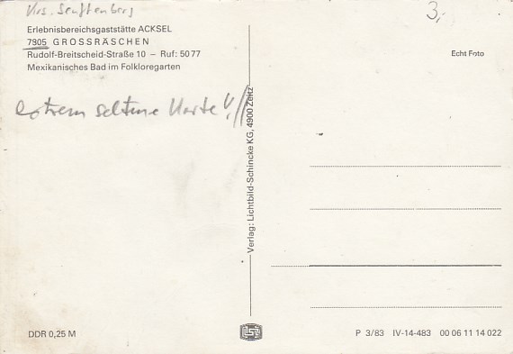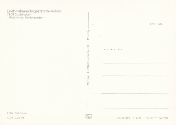 731 [7805o38] |  | Großräschen Gross-Räschen Niederlausitz Gaststätte Acksel 1978 | 4.00EUR 3.00EUR | In den Warenkorb |
